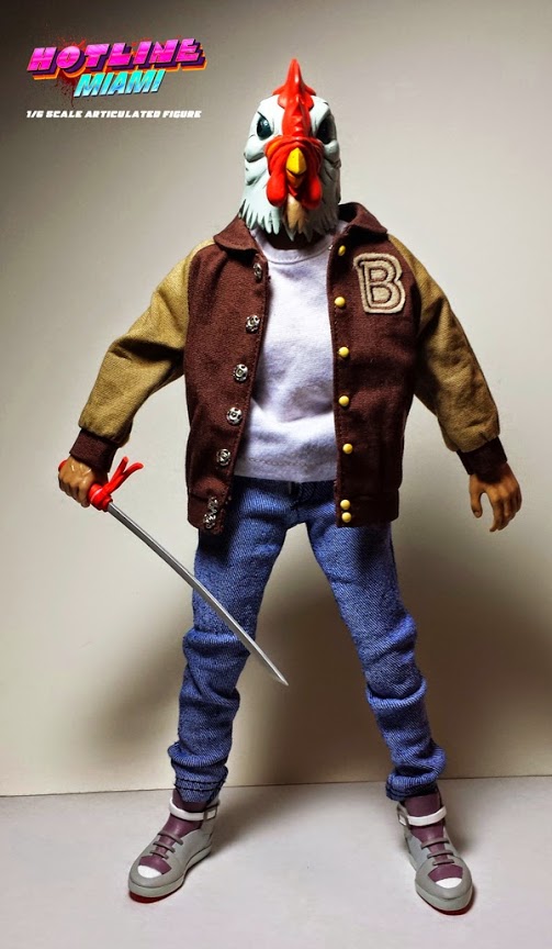 Based on the award winning (and amazingly retro) PC game Hotline Miami, the figure is slated to include four removable heads: Tony (Tiger), Richard (Rooster), Aubrey (Pig), and a bloody, bandaged Jacket head. The figure also comes with interchangeable clothing including a letter jacket, t-shirt, pair of jeans, Air Vigilante sneakers and a hospital gown. There will be three weapons - a shotgun, baseball bat, and katana.