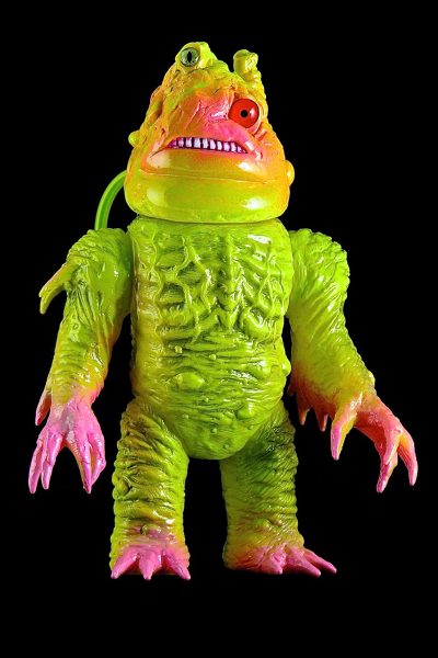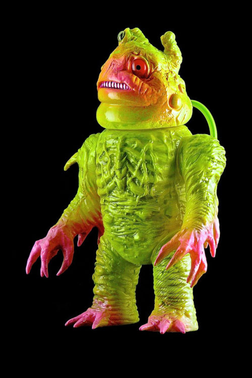 Bob Conge has announced a new one-of-a-kind custom from Plaseebo. The Gunkanjima X-1 features Plaseebo's “Gunkanjima” resin head on a Skull Head Butt “X” vinyl body. The 8-inch tall figure has a pair of power tubes that run from the body to the head and an internal motion activated color-changing LED unit with replaceable batteries. It's been signed by Bob and dated 2015.