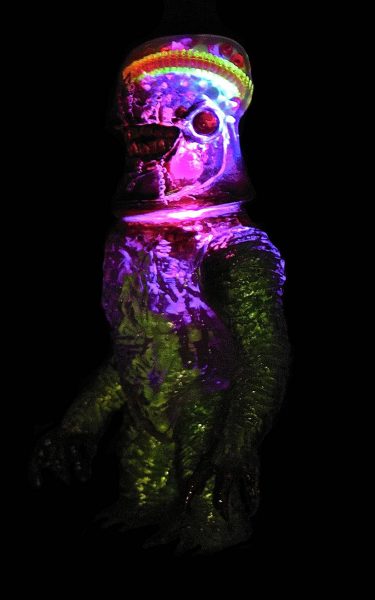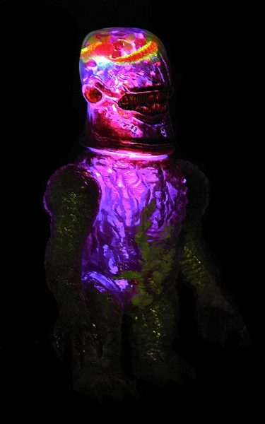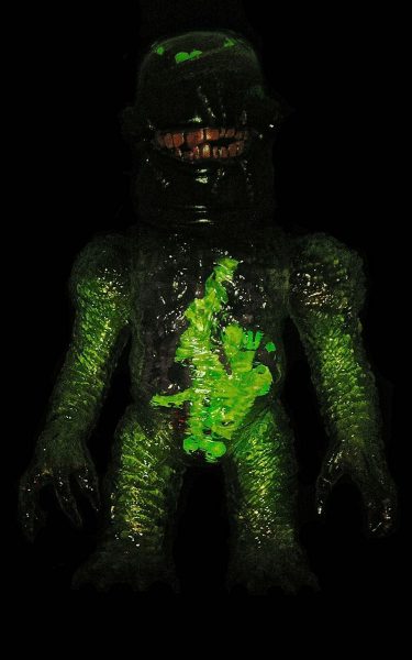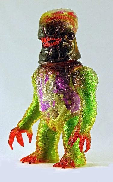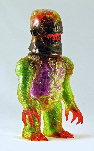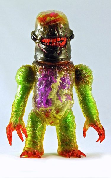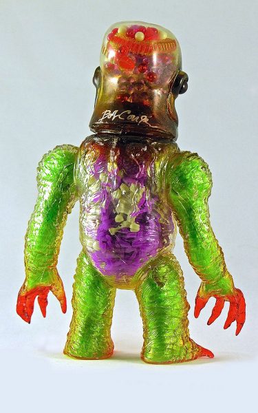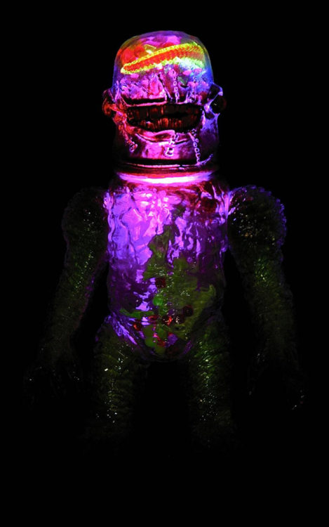 Plaseebo has announced another one of a kind custom. The X-Ray Gnaw 2 - GUTS and GLORY clear vinyl piece features a Plaseebo “Gnaw” head on a Skull Head Butt “X” body with red glass inset eyes and an internal motion-activated, color-changing LED unit that illuminates the glow in the dark human body parts and guts withen the body cavity and brain case . The 8-inch tall figure has various Monster Kolor sprays and is signed by artist Bob Conge. The X-Ray Gnaw 2 will be available from the Plaseebo web shop beginning on Tuesday, April 12th 2016.