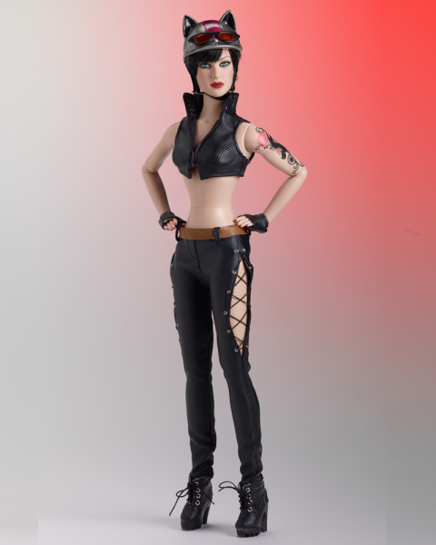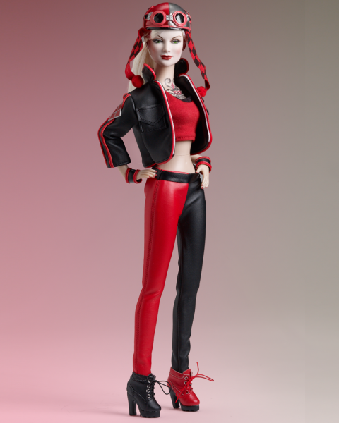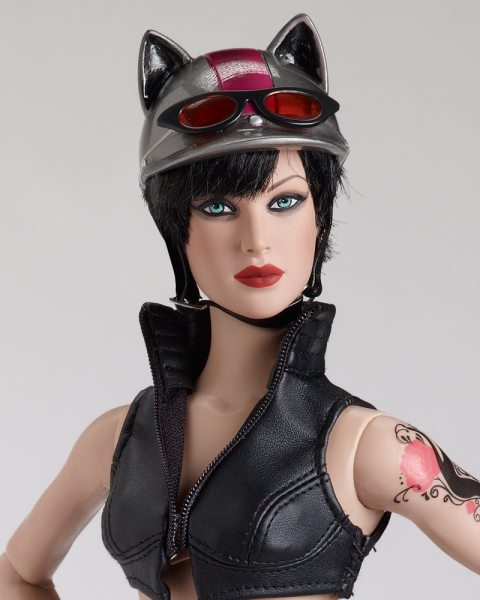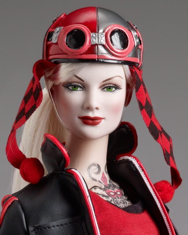 Tonner Doll Company has released a pair of 16-inch tall dressed dolls from their Gotham Garage series. There are the Catwoman (above) and Harley Quinn (below) dolls. They're each done up like "biker chicks", complete with motorcycle helmet, lots of leather, and tattoos. Each figure is a limited edition run of 300 pieces and costs $190.00.