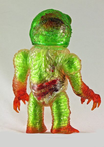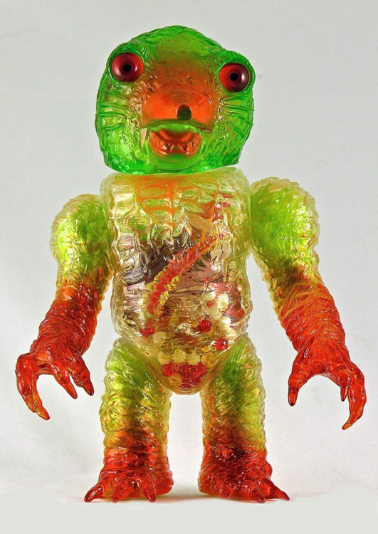 Plaseebo has announced the one-off Molezilla-X. A one of a kind custom clear vinyl piece with a Plaseebo Molezilla head on a Skull Head Butt “X” body, the piece features red eye inserts and an internal motion activated color-changing LED unit that illuminates the color gel and glow in the dark innards of the body and brain case. The 8-inch tall figure has various Monster Kolor sprays and is signed by the artist - Bob Conge.