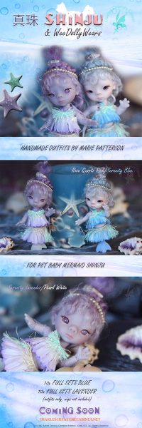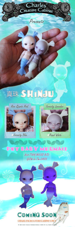 Charles' Creature Cabinet has announced their newest ball-jointed doll - the tiny/micro 8cm (3.15-inch) BJD Shinju Pet Baby Mermaid. The limited pre-order period will run through Thursday August 11th 2016. The figure is available in both pink/blue and lavender/pearl white colorways. Each one includes a faceup, glass eyes, fins antler, dreaming eyes goggles, and a special pillow pouch. They're priced at €249 (about $274). There's also an option for the Shinju Full Set, which includes a WeeDollyWears Outfit. There are 10 pieces of each color version available for €267 (about $293) and they include the Shinju outfit (not the wig).