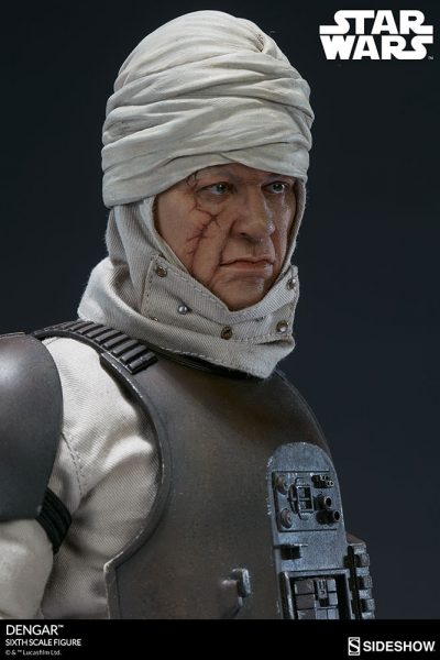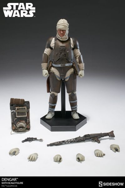 Available exclusively through Sideshow, the 1/6th scale Dengar figure features a highly detailed movie-accurate head portrait with a fabric face cover and sculpted head wrap. His outfit includes a padded fabric under-suit, flight suit, belt, and pouches (including a leather-like holster), sculpted boots, and a highly detailed backpack which contains both sculpted and fabric components. Each Dengar figure also comes complete with four sets of hands, his Blaster Pistol and Carbine, and a Hex Base for display emblazoned with the Star Wars logo.