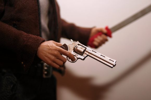 As far as accessories, Rick includes five hands. There are relaxed, holding, and a right hand that’s sculpted for holding a gun. From Rick’s belt hangs a Colt python .357 revolver in its holster as well as a red-handled machete in its sheath. The big gun is an AKM assault rifle. I had to look online where to place the carabineer that hooks the strap at the barrel end. I’m still not sure I have it correct.