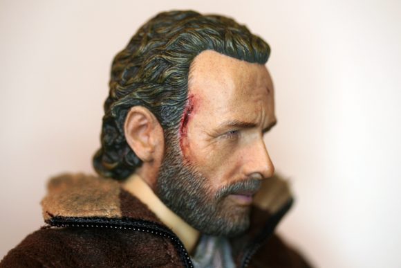If you do a search for Rick Grimes, you’ll notice his beard is not consistent. It sometimes has a little grey in it; other times it’s predominantly grey and dirty blonde; still others, it looks like Rick found a bottle of Just For Men and dyed it all dark brown. As far as the face sculpt, I’d say it’s about 95% Andrew Lincoln. It’s a case of, from this angle he looks perfect and from that angle...I’m not so sure.