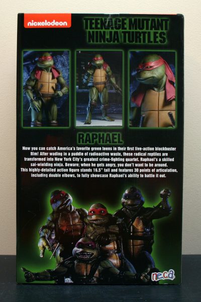 Fast forward 27 years, and NECA has started releasing quarter-scale figures based on the film license. These are large, 16.5-inch tall beasts with a lot of heft and just as many points of articulation (they say about 30). To date, they’ve released Leonardo and – just recently – Raphael. Thanks to NECA, we’ll be featuring the Raphael figure in this review.