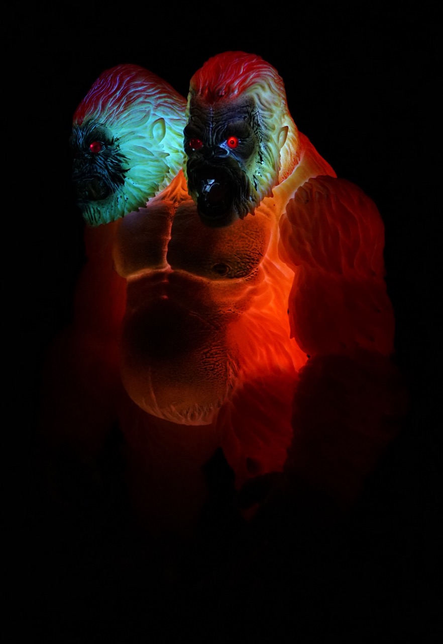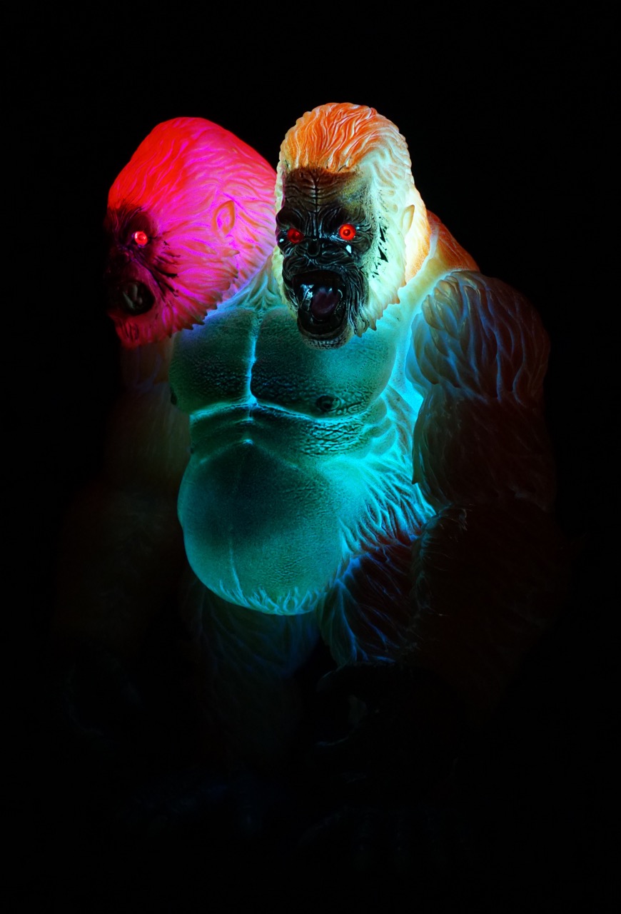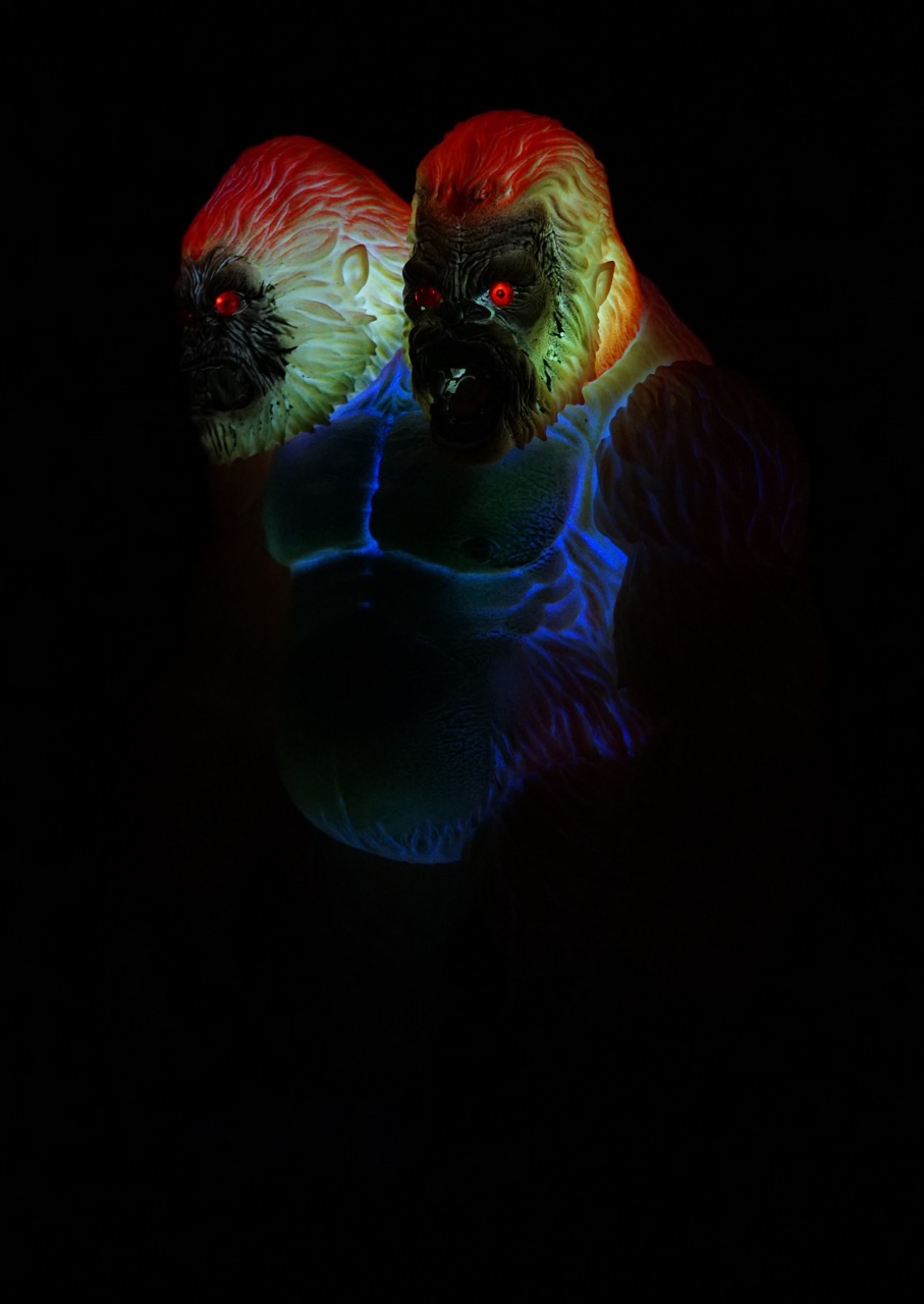 The "Electro Death Galiathon" has see-thru Monster Kolor sprays over the glow in the dark vinyl and red inset eyes. He also has 4 motion activated color-changing LED units with replaceable batteries.