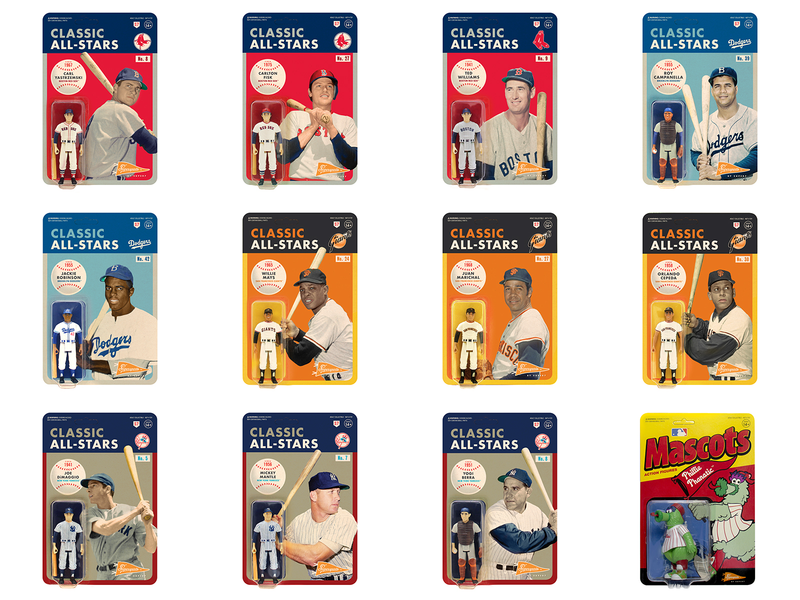 The MLB Classic ReAction Series includes the following: Carl Yastrzemski (Boston Red Sox); Carlton Fisk (Boston Red Sox); Ted Williams (Boston Red Sox); Roy Campanella (Brooklyn Dodgers); Jackie Robinson (Brooklyn Dodgers); Willie Mays (San Francisco Giants); Juan Marichal (San Francisco Giants); Orlando Cepeda (San Francisco Giants); Joe DiMaggio (New York Yankees); Mickey Mantle (New York Yankees); Yogi Berra (New York Yankees); Phillie Phanatic (Philadelphia Phillies).