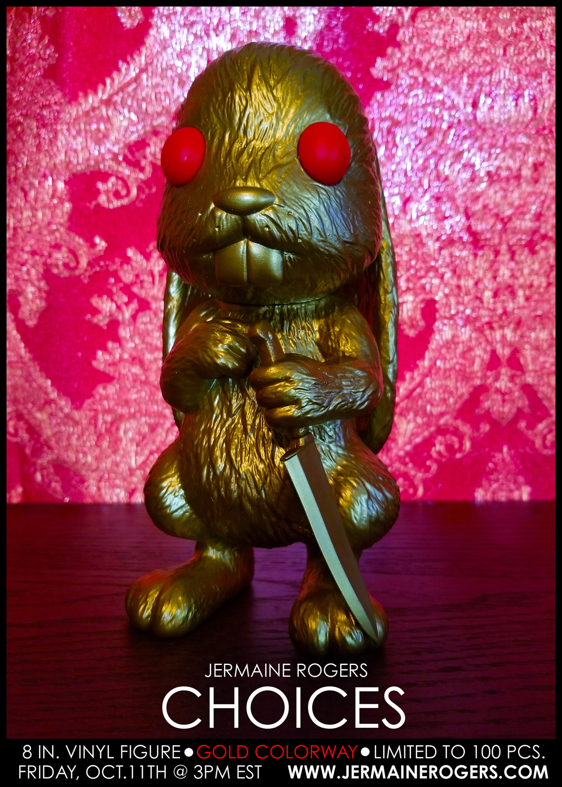 This Friday October 11th 2019, at 3PM ET, artist Jermaine Rogers - via his website - will be dropping his CHOICES: 'GOLD' Colorway. This "little bunny must make an important choice…and he holds the instrument to carry out his decision. What will bunny choose, and what will the implications of that decision be?" The Gold version is the first of four remaining colorways that will be produced. This 8-inch tall vinyl figure is limited to a run of 100 pieces and will sell for $90.00.