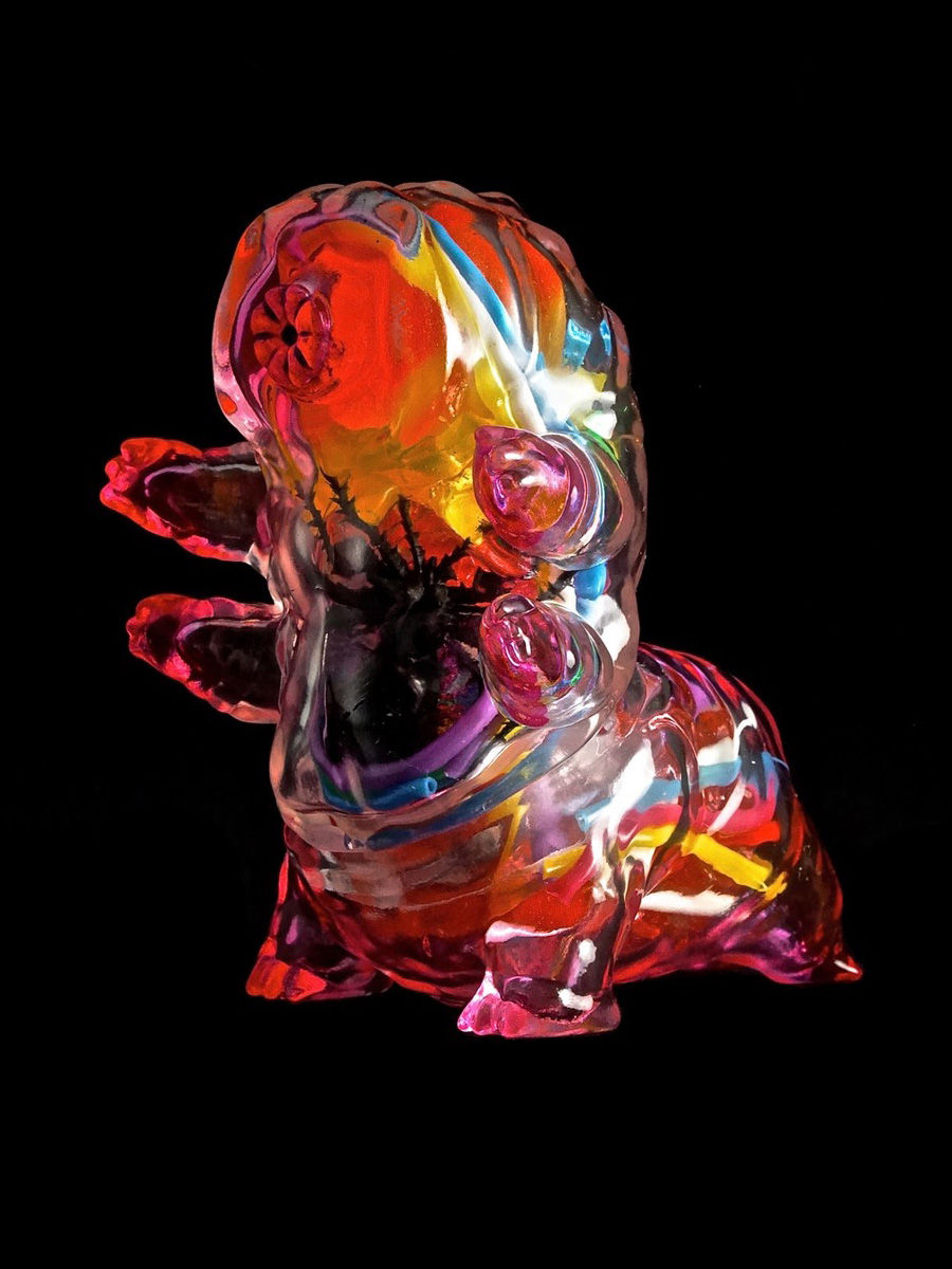 The clear vinyl “Electro Tarbus” is filled with space junk and spiders. It has 2 internal motion activated color-changing LED units, is painted with see-thru Monster Kolor sprays, and comes signed by Bob.