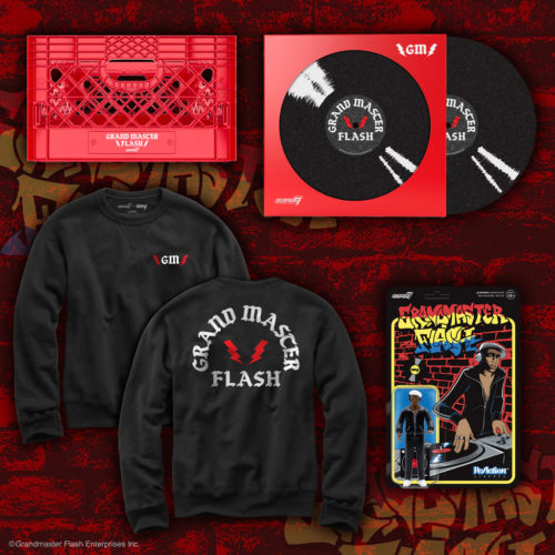 That collection comes loaded with a literal crate-full of fresh merch that pays homage to the early days of the Hip-Hop pioneer’s career, when he hauled all of his records and gear to gigs in milk crates. In addition to the Grandmaster Flash ReAction figure, it includes a custom bright red milk crate featuring the Grandmaster Flash logo, a black crewneck sweatshirt inspired by his iconic handmade jacket (as seen in Wild Style), and a pair of DJ slipmats packaged in a branded LP sleeve. A must-have for the Grandmaster Flash aficionado.